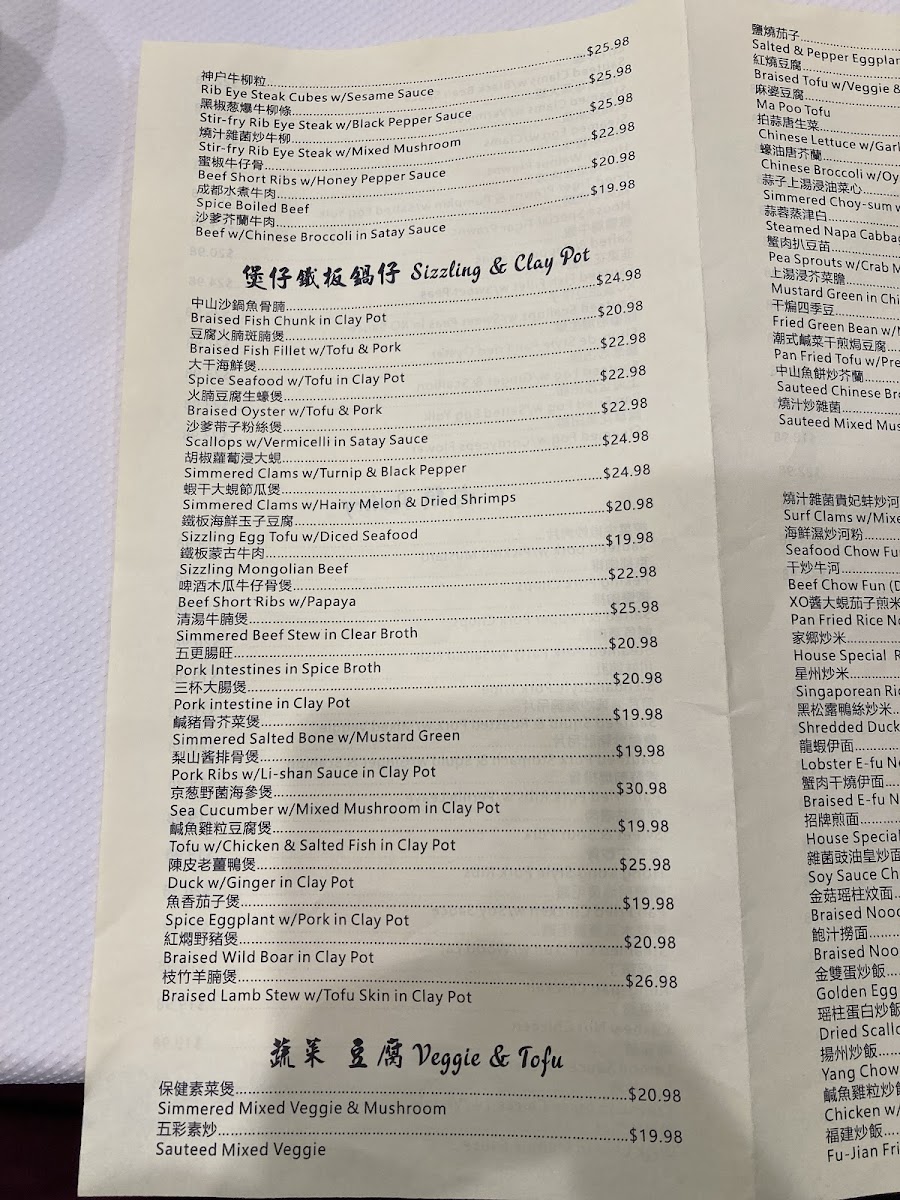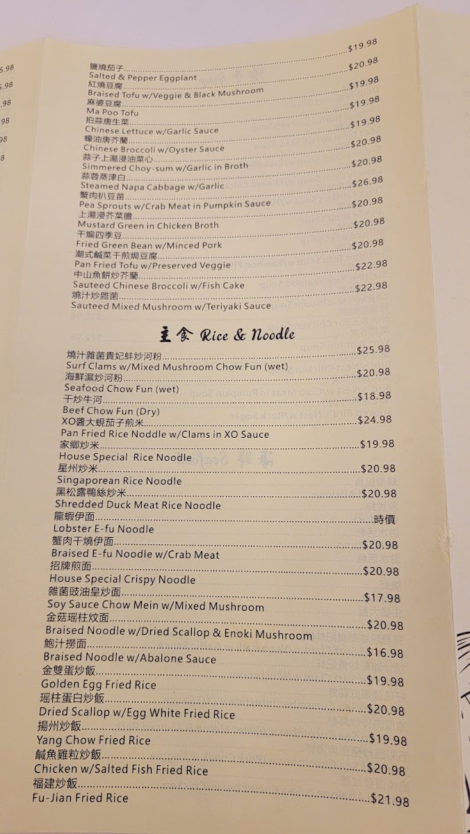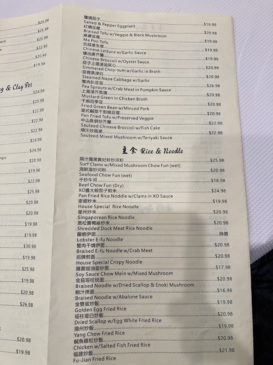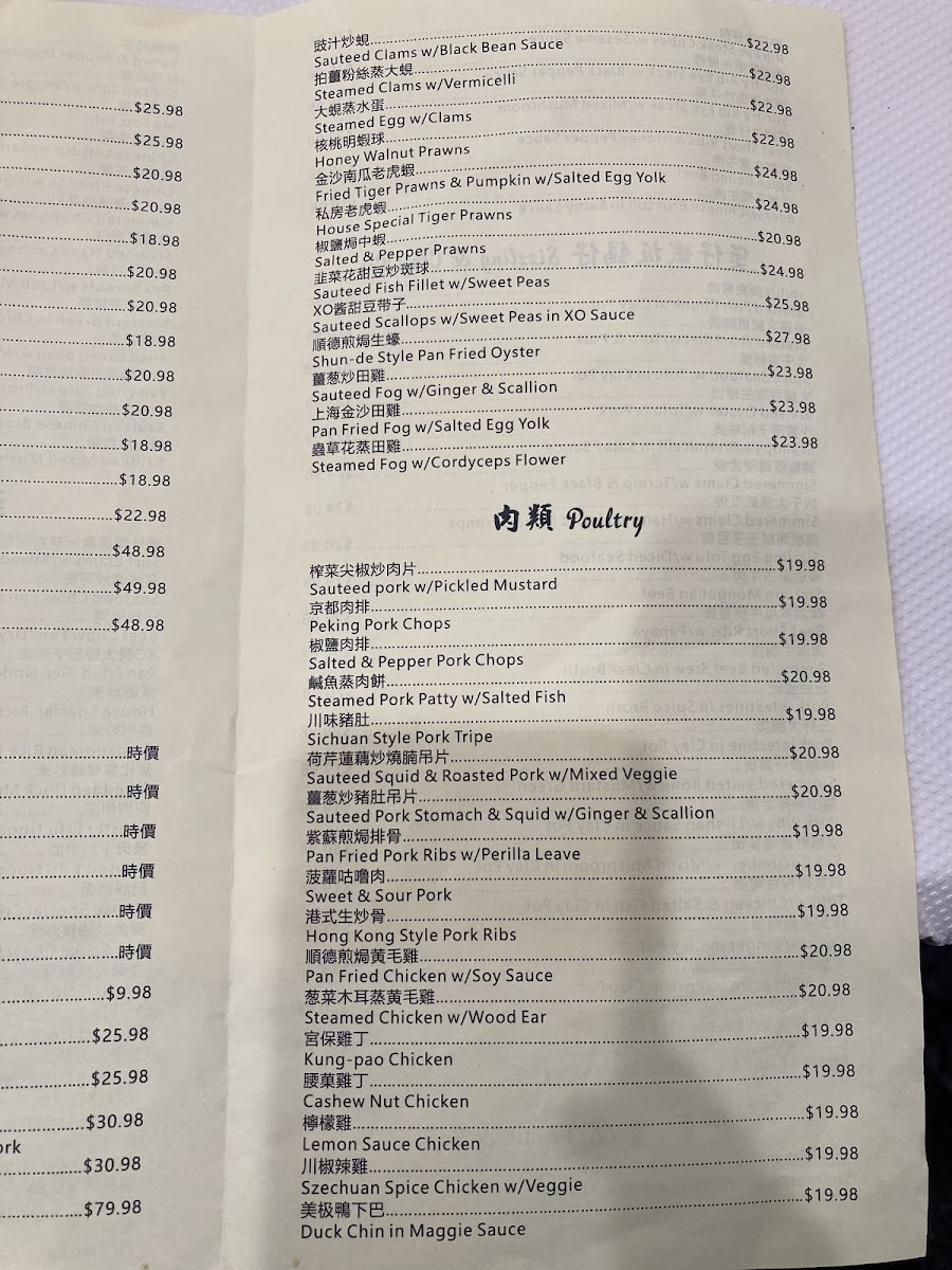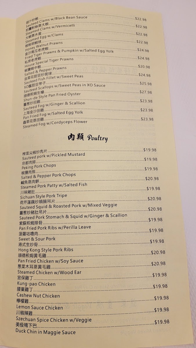Seafood offerings comprise dishes like steamed surfclam with vermicelli in garlic sauce, sautéed clams with black bean sauce, honey walnut prawns, fried prawns with salted egg yolk, and other seafood prepared with a variety of sauces and styles. These entrées provide options for more substantial meals.