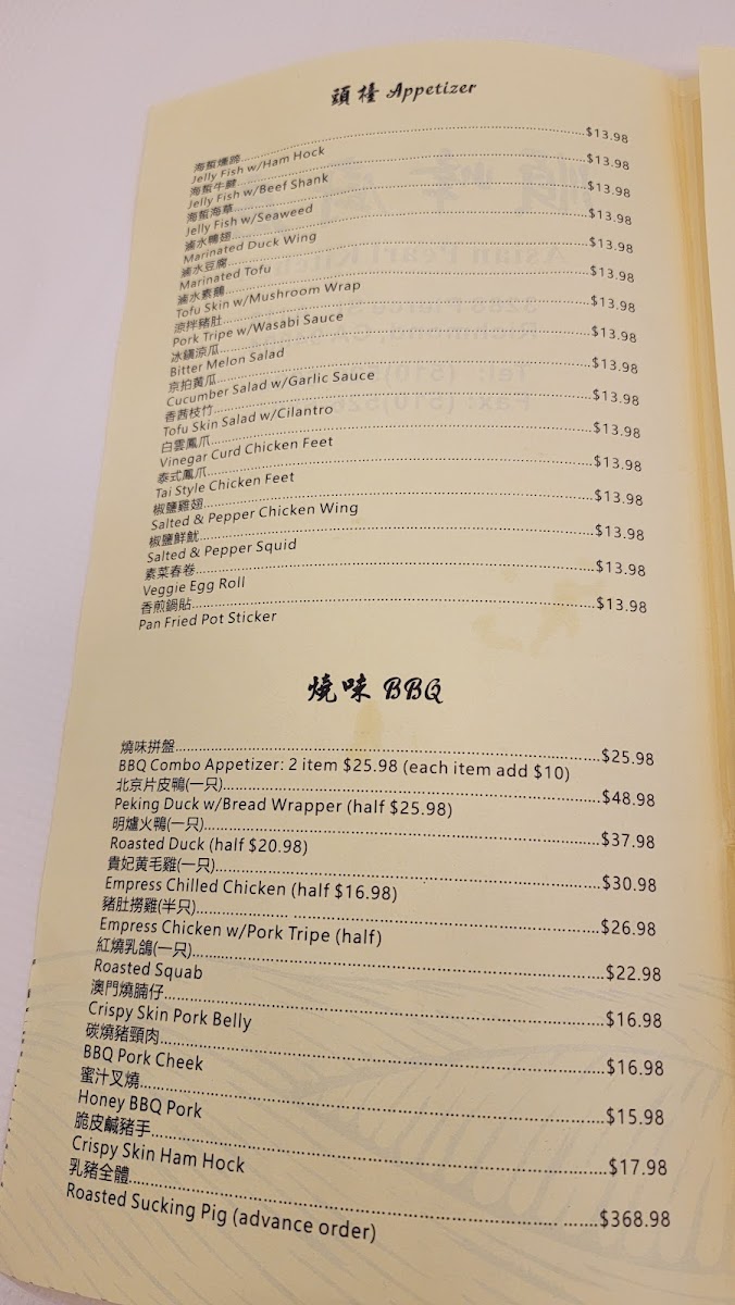 Additional menu highlights include beef chow fun dry, egg custard tart, Peking duck skin with steamed baos, white cut chicken, pork belly variations, seafood pan-fried noodles, chicken wings, and multiple roasted pork dishes. Hot tea is also available to accompany the food.